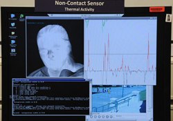 On Thursday, subjects walked one byone into a trailer with a makeshift checkpoint. A heat camera measured skin temperature. A motion camera watched for tiny skin movements to measure heart and breathing rates.
